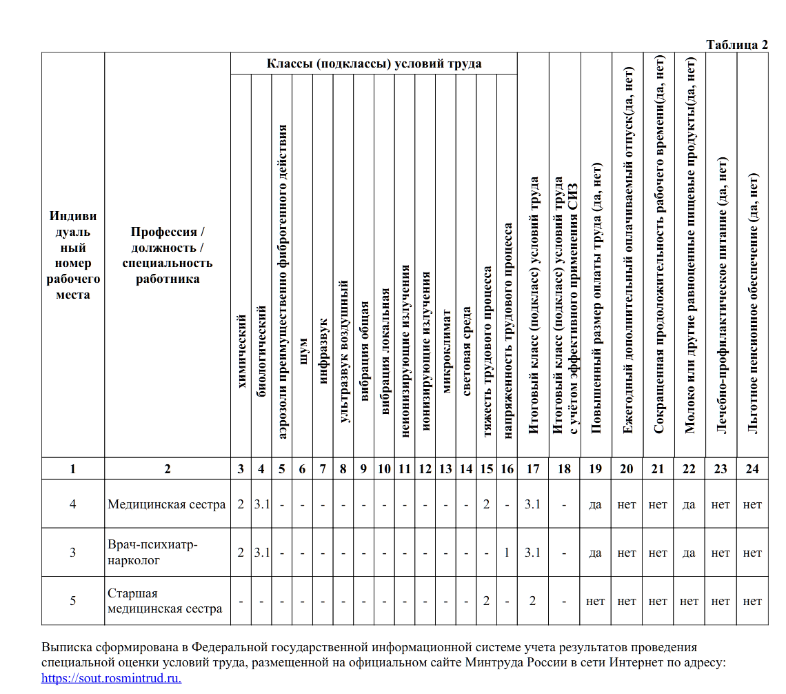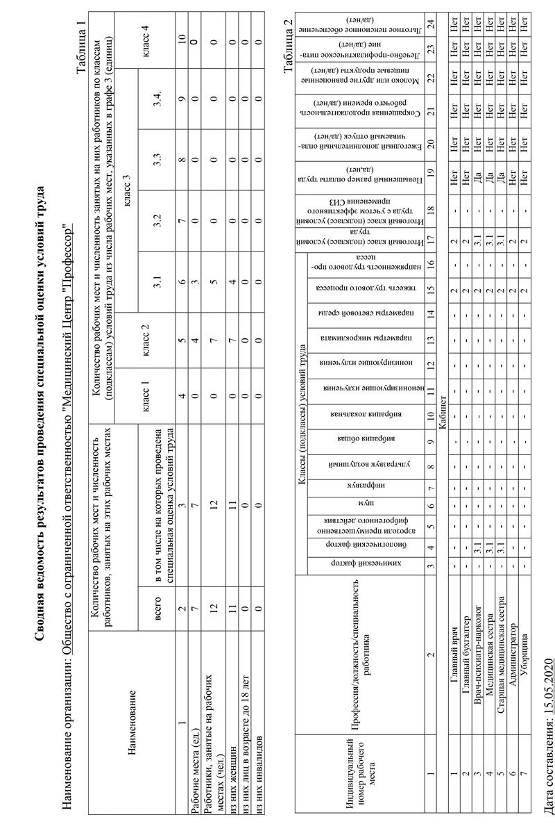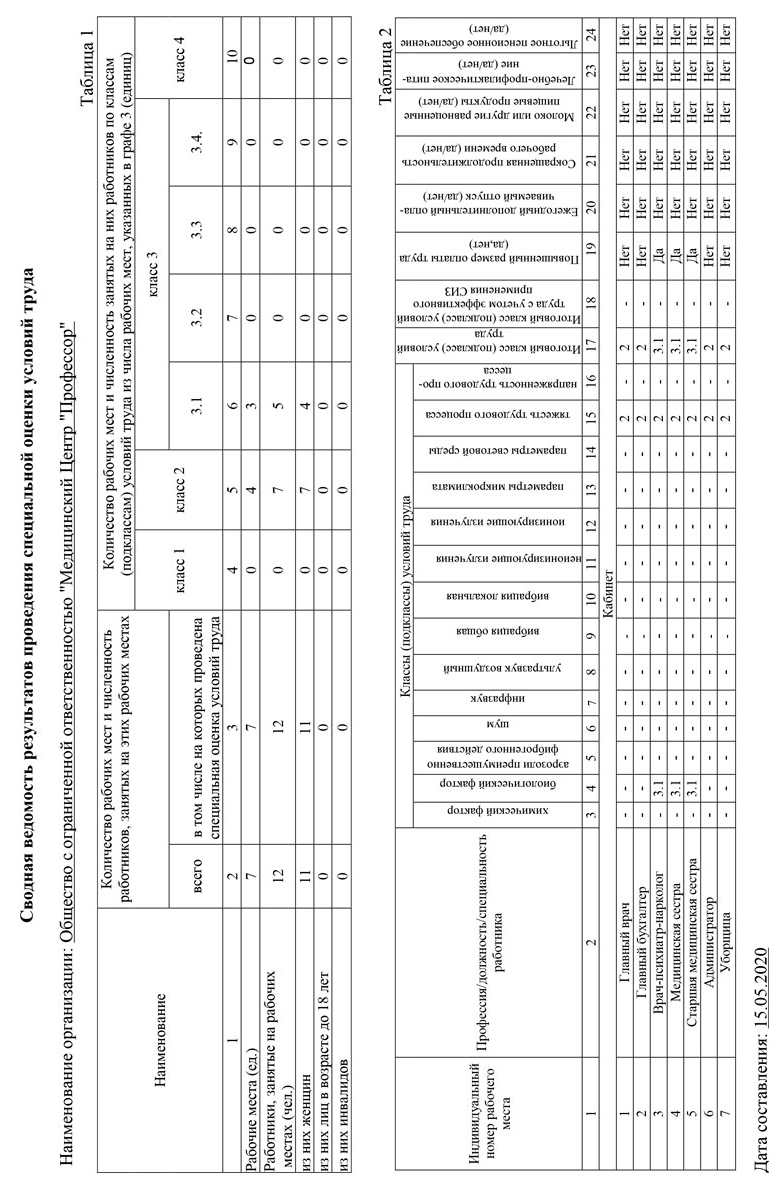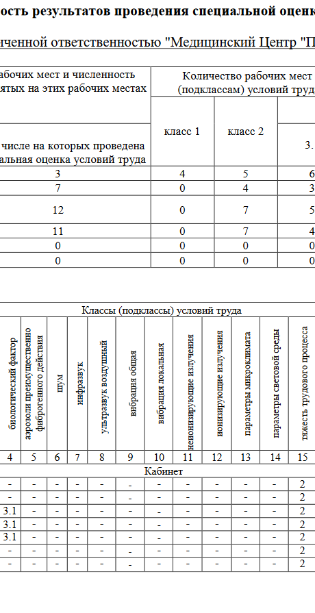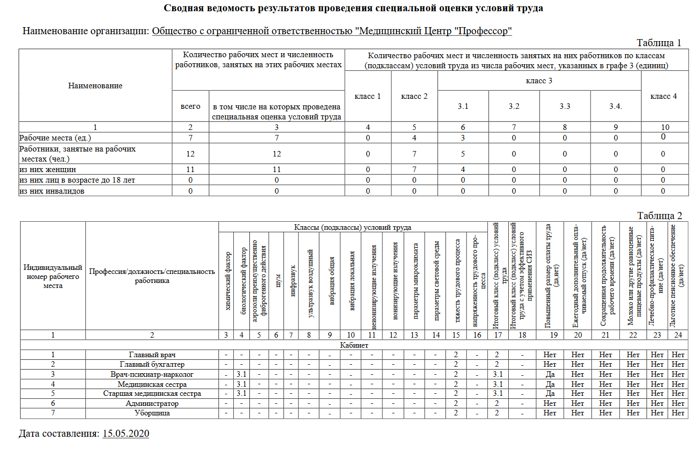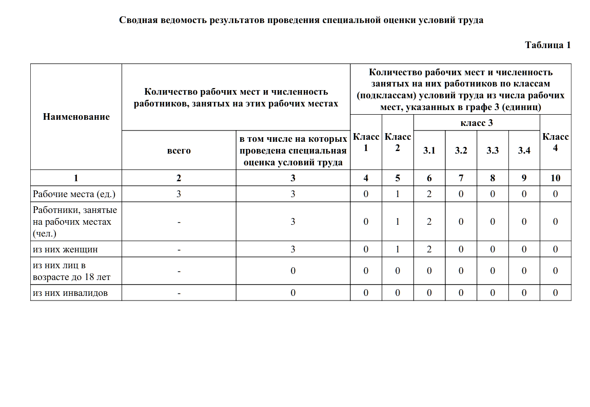 Сводная ведомость результатов проведения специальной оценки условий труда